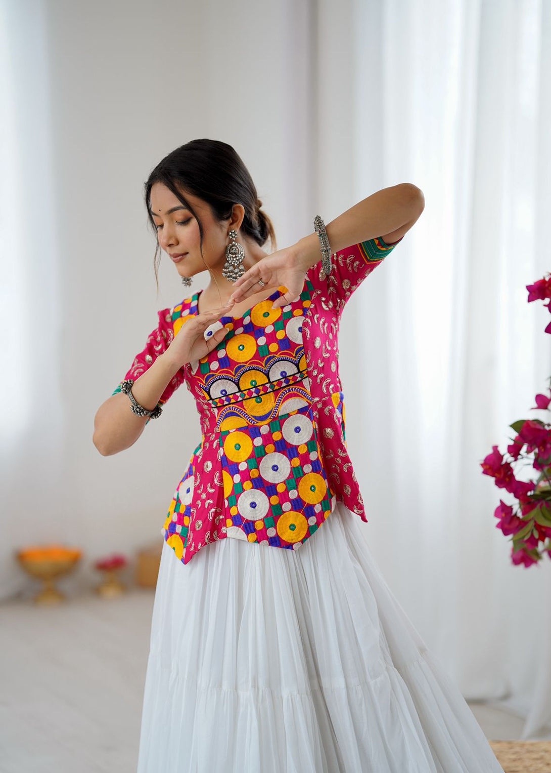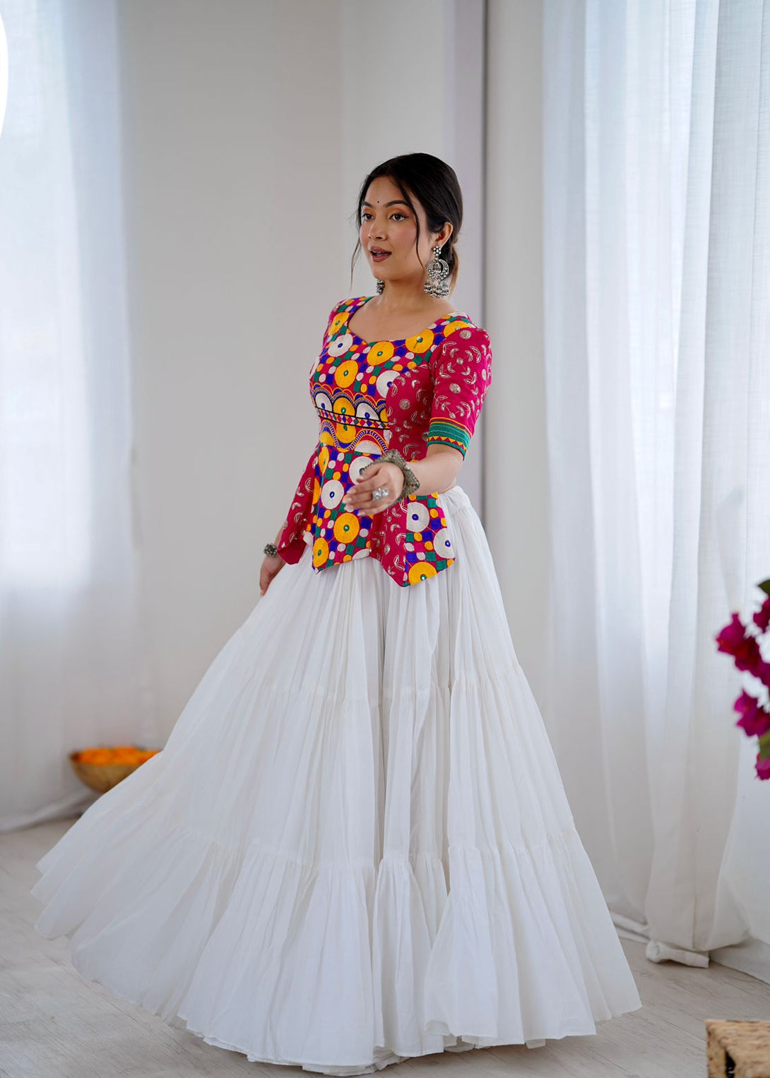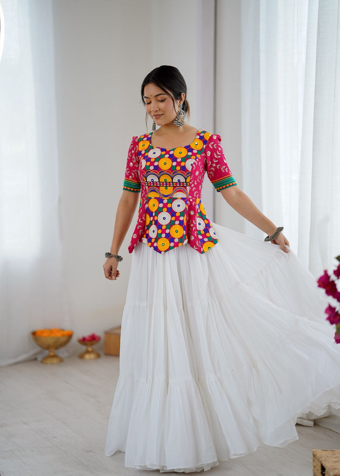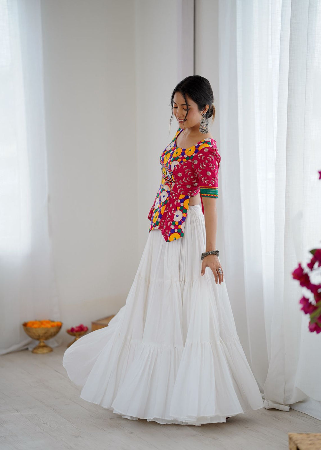 Colorful Mirror Work Peplum Top with White Tiered Lehenga – Navratri & Garba Traditional Set for Women