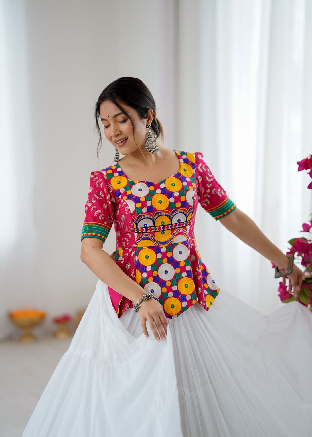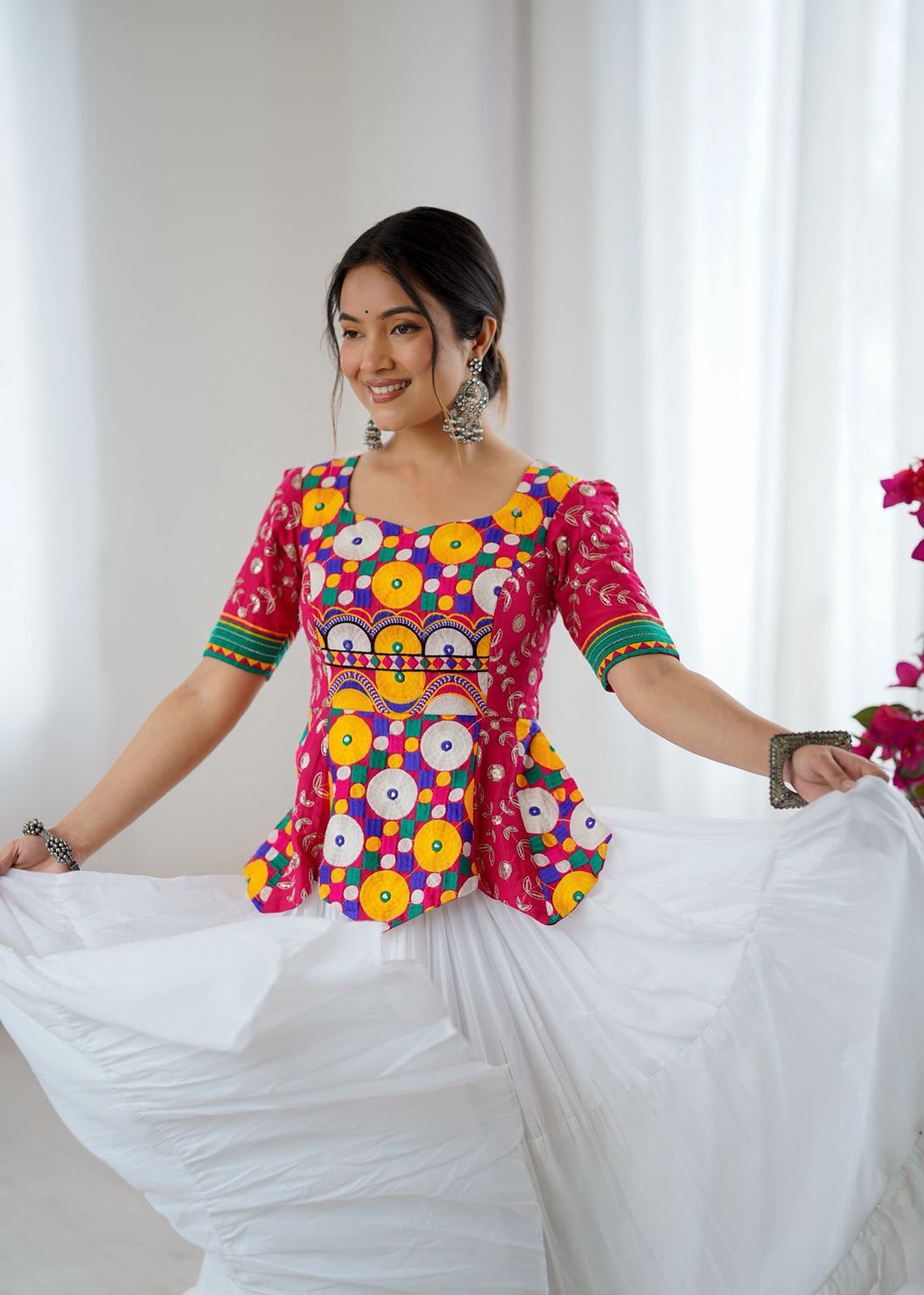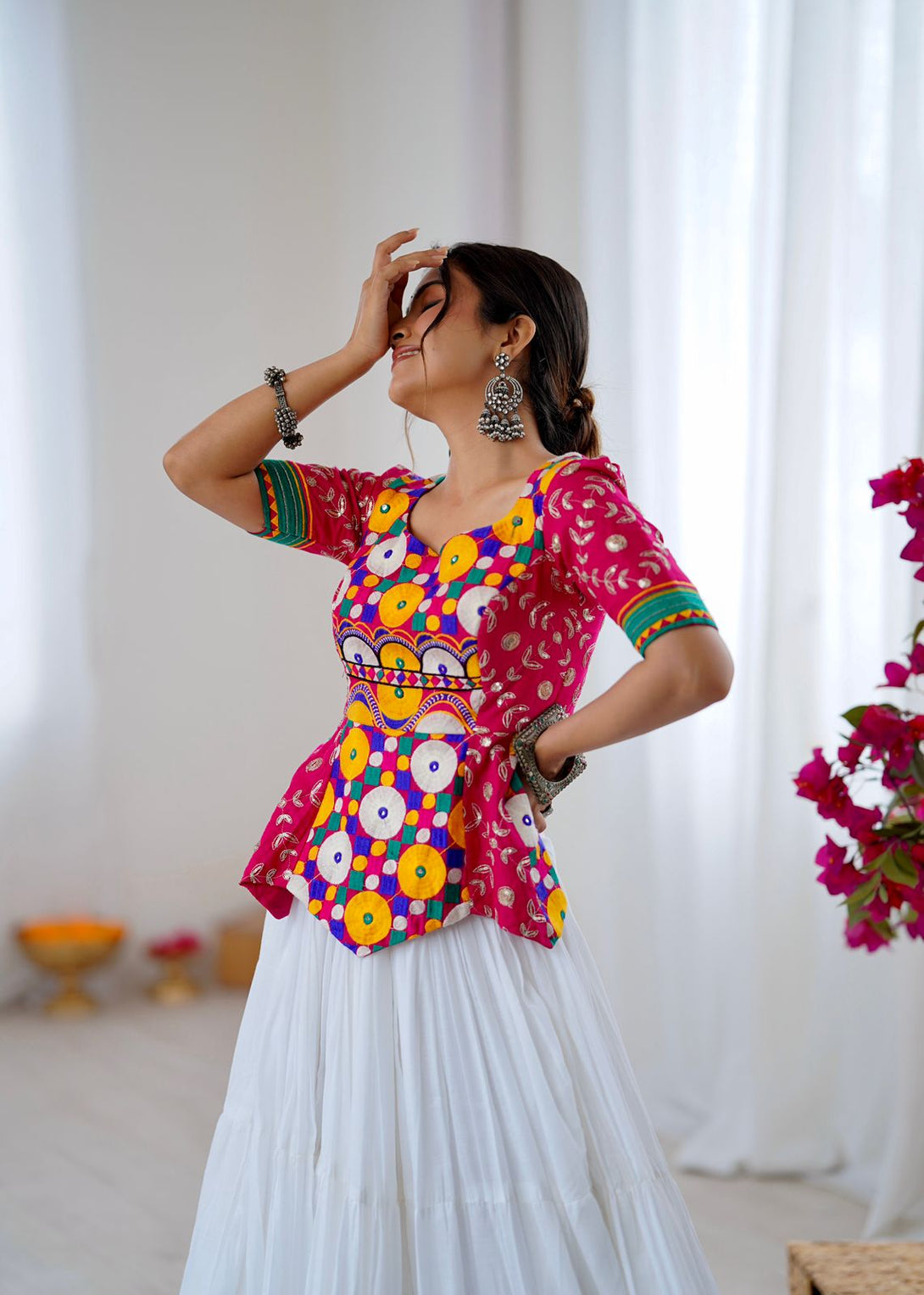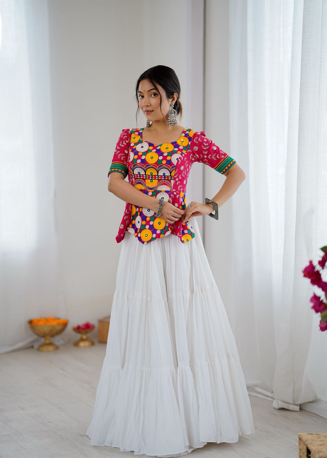 Colorful Mirror Work Peplum Top with White Tiered Lehenga – Navratri & Garba Traditional Set for Women