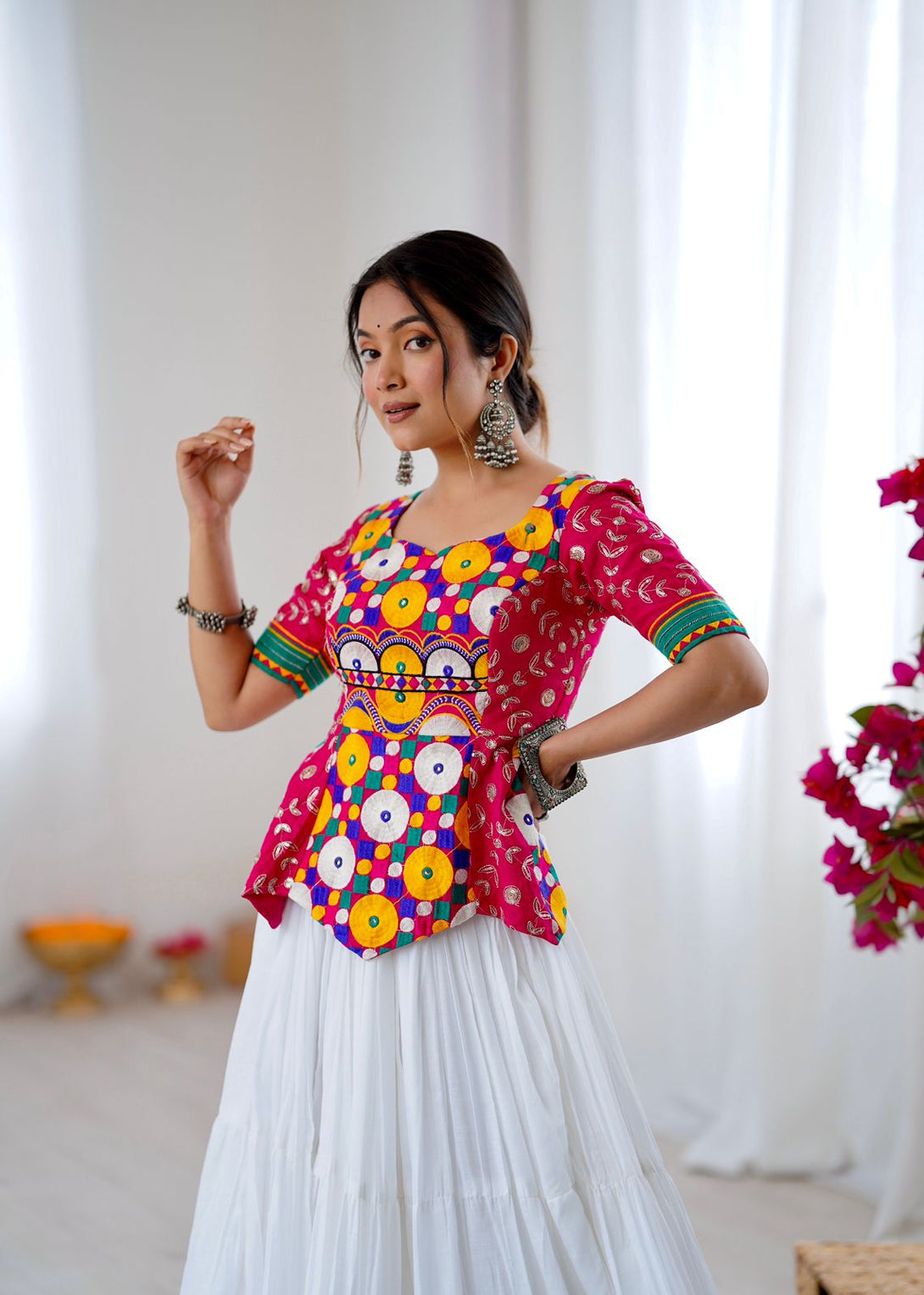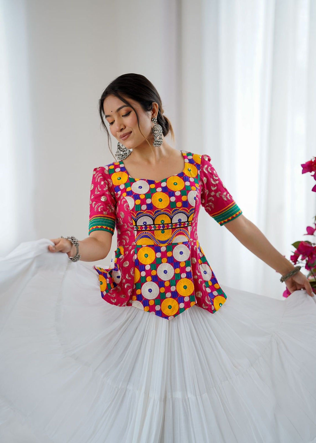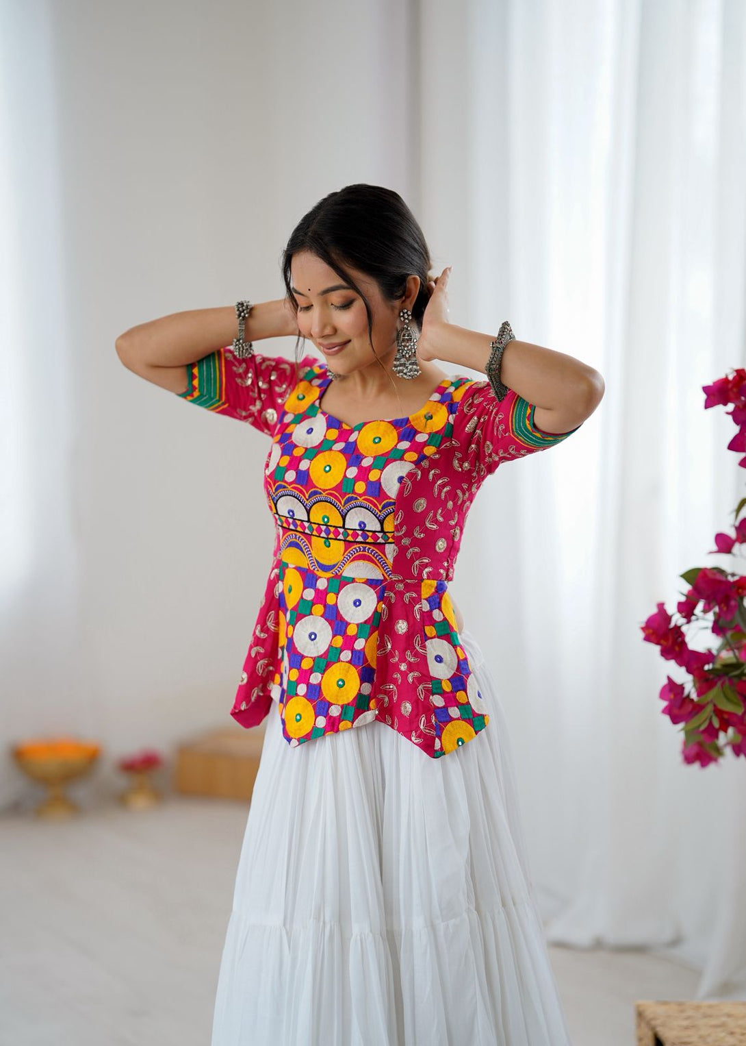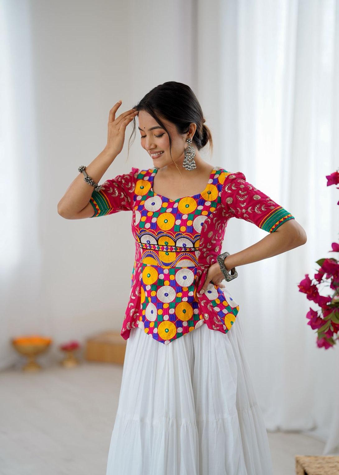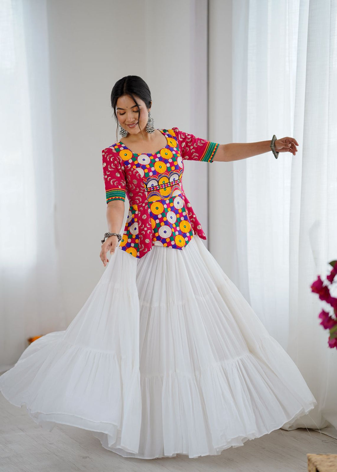 Colorful Mirror Work Peplum Top with White Tiered Lehenga – Navratri & Garba Traditional Set for Women
