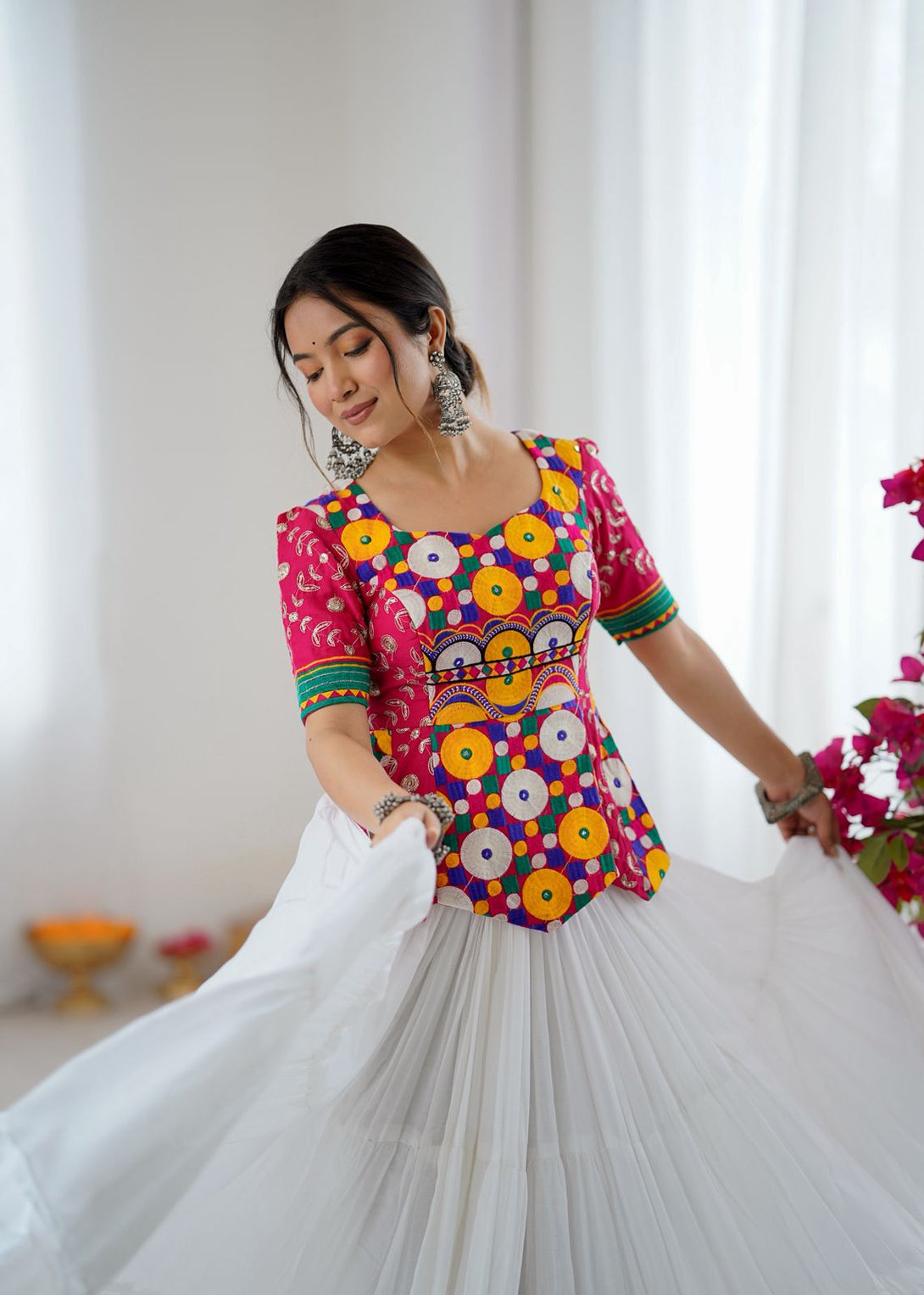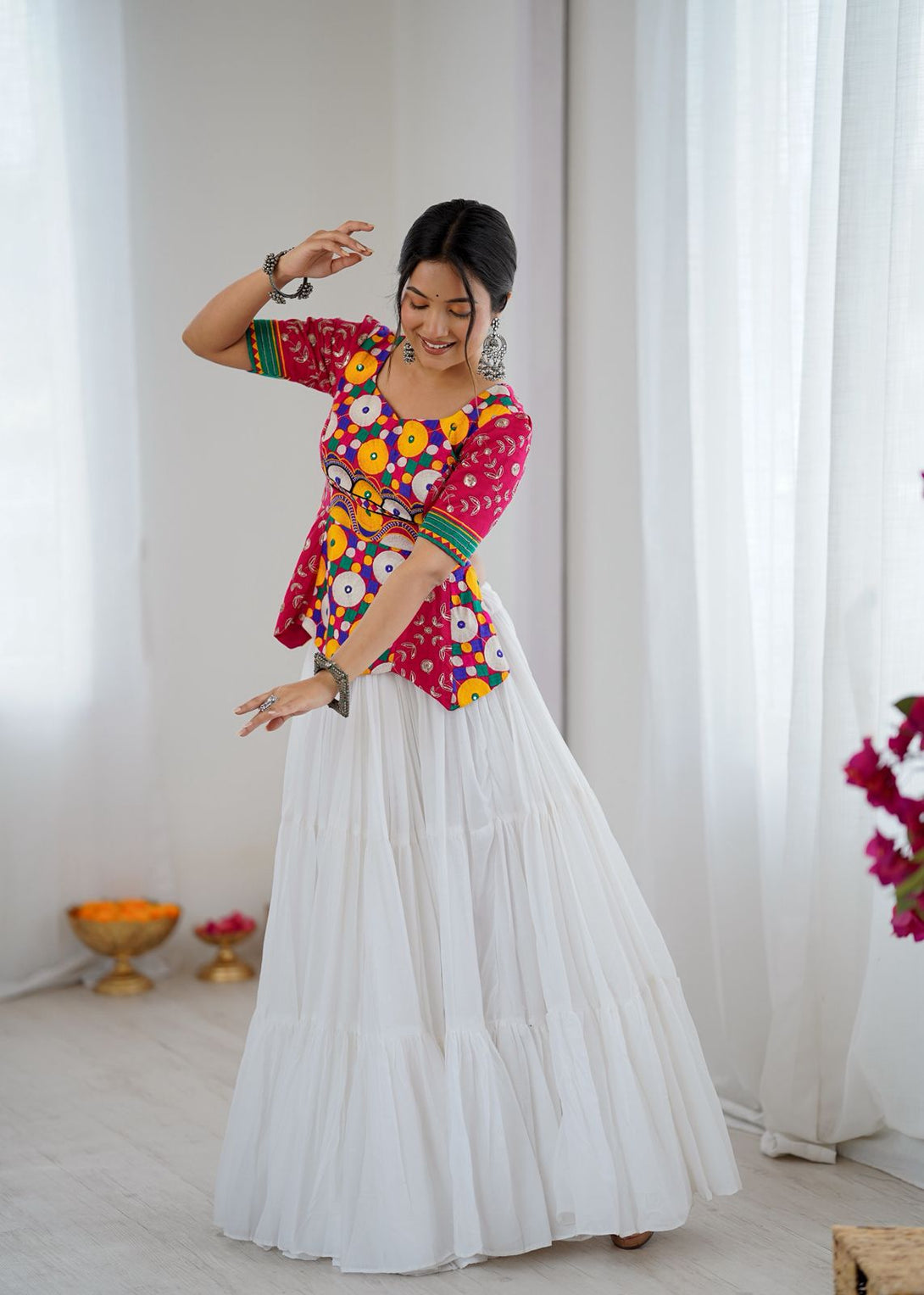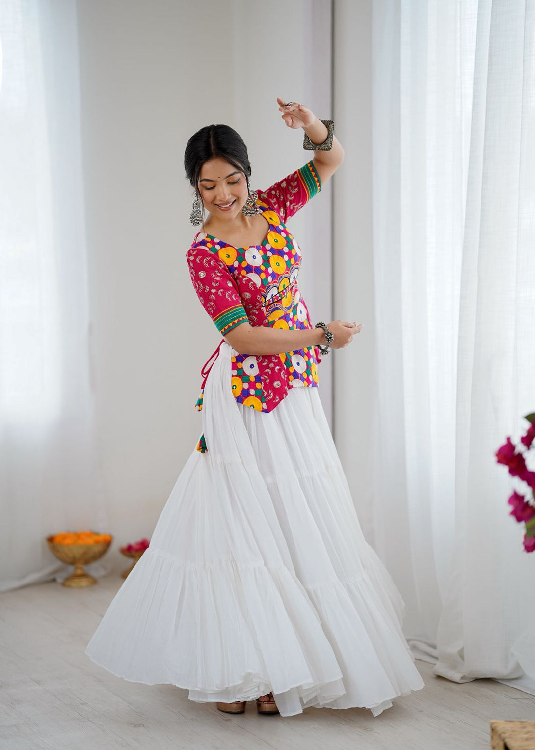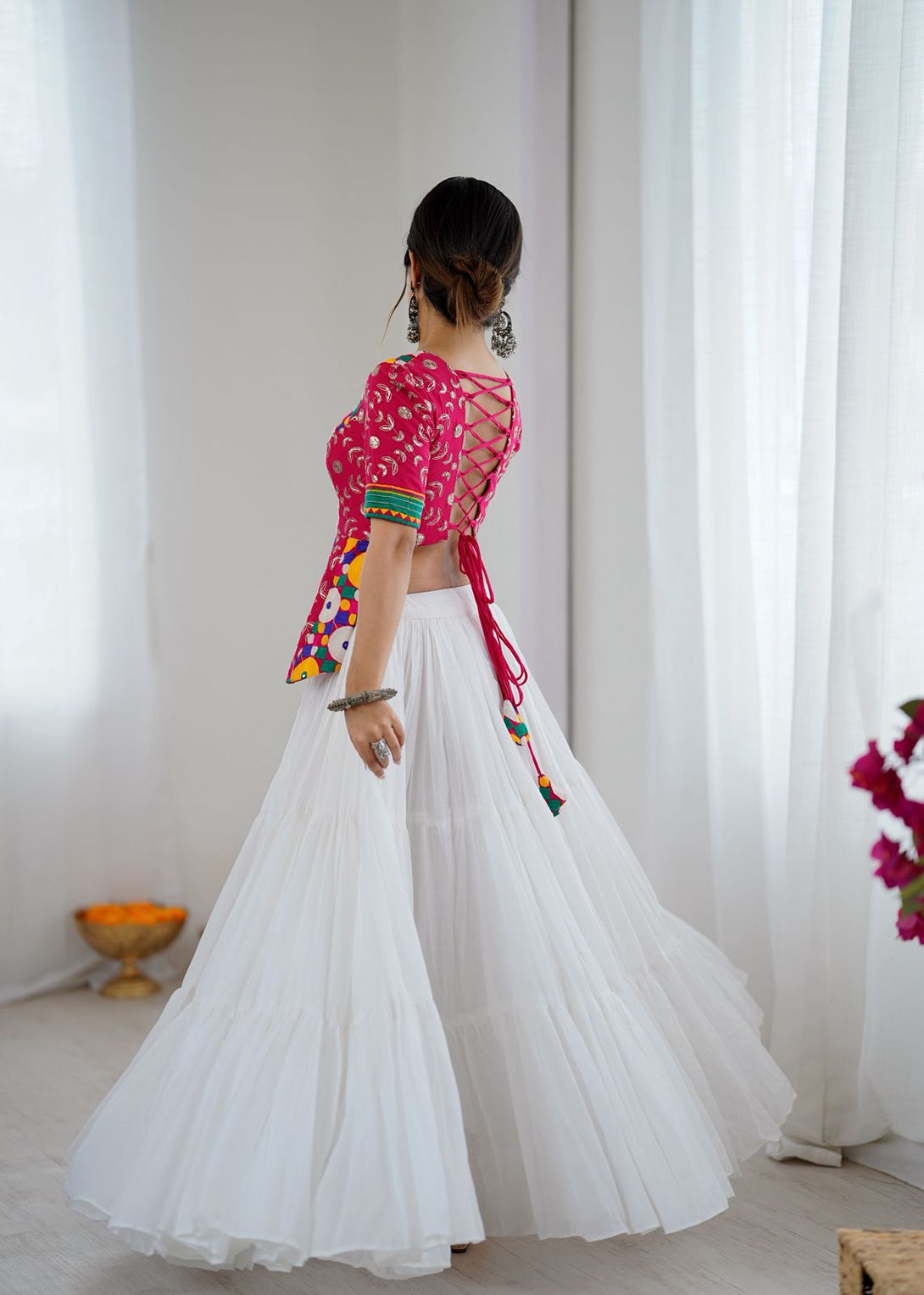Colorful Mirror Work Peplum Top with White Tiered Lehenga – Navratri & Garba Traditional Set for Women