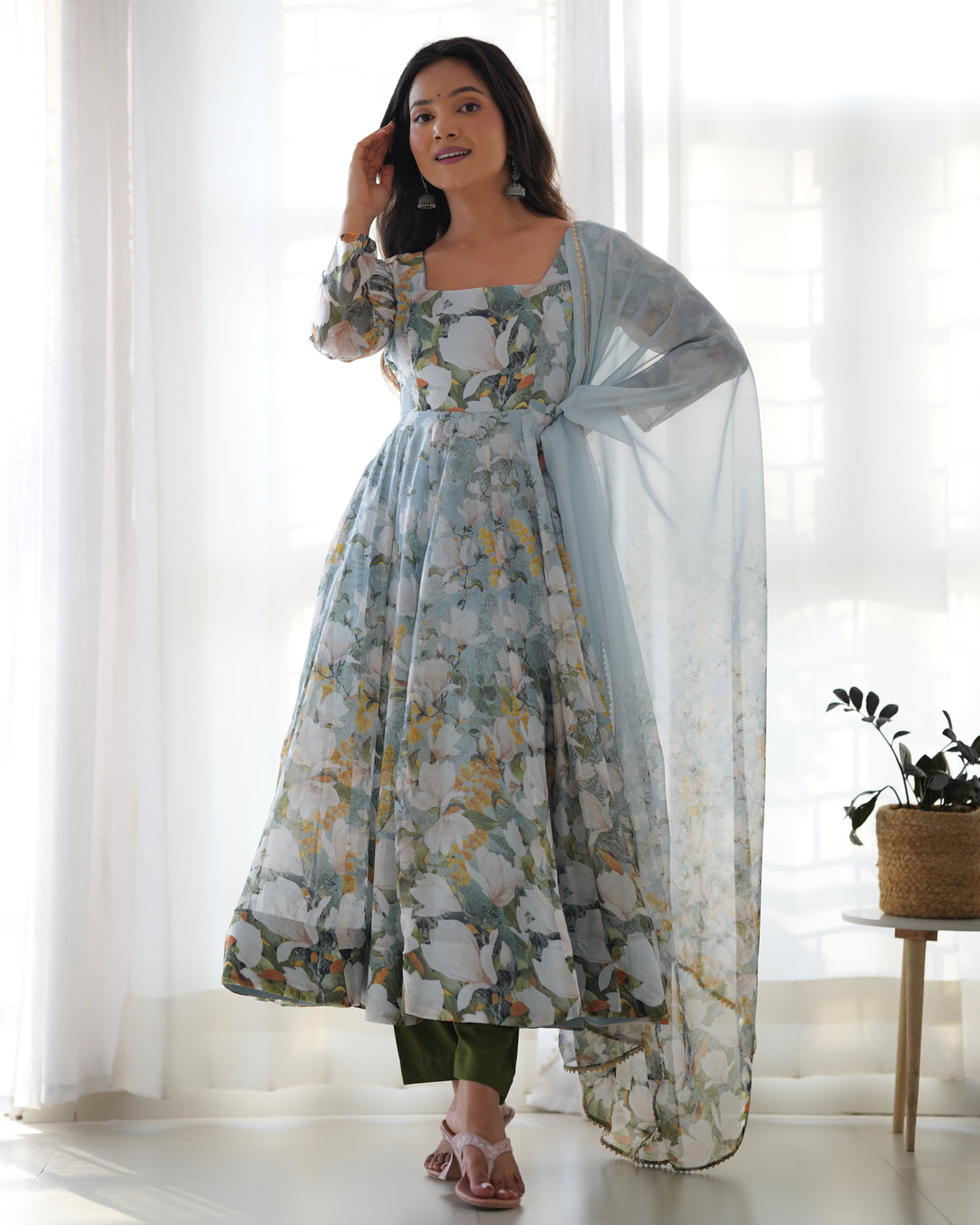 Elegant Floral Organza Gown with Dupatta & Pant | Soft Silk Fully Flared Ready-to-Wear Suit