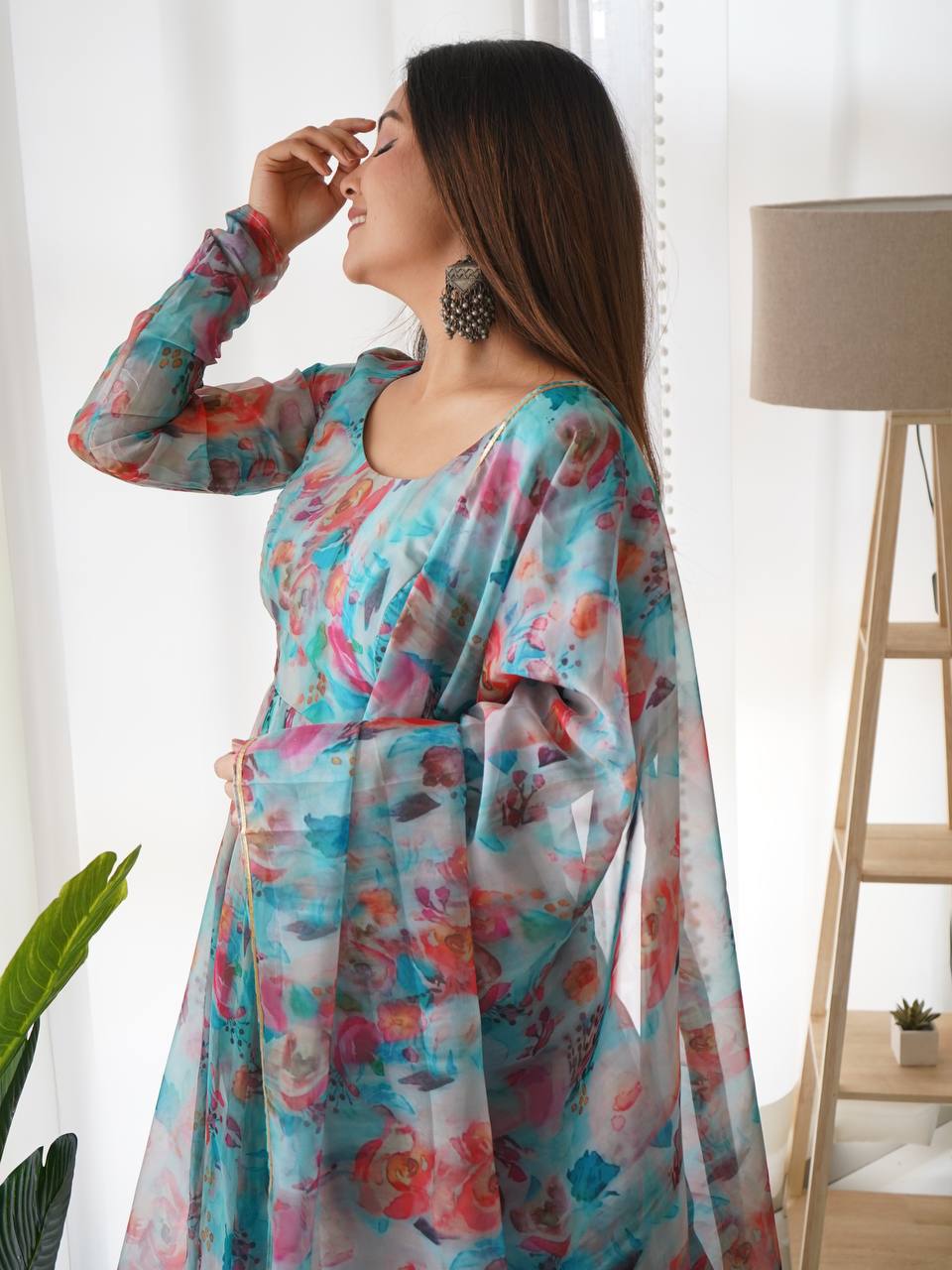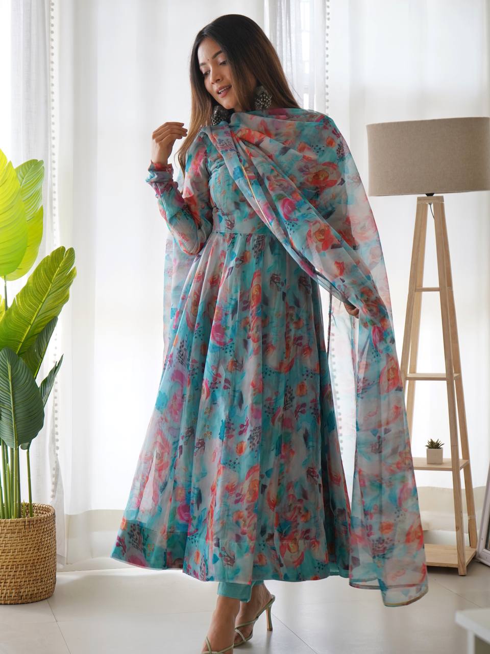 Pastel Watercolor Floral Suit Set with Dupatta – Lightweight Organza Ethnic Wear for Summer