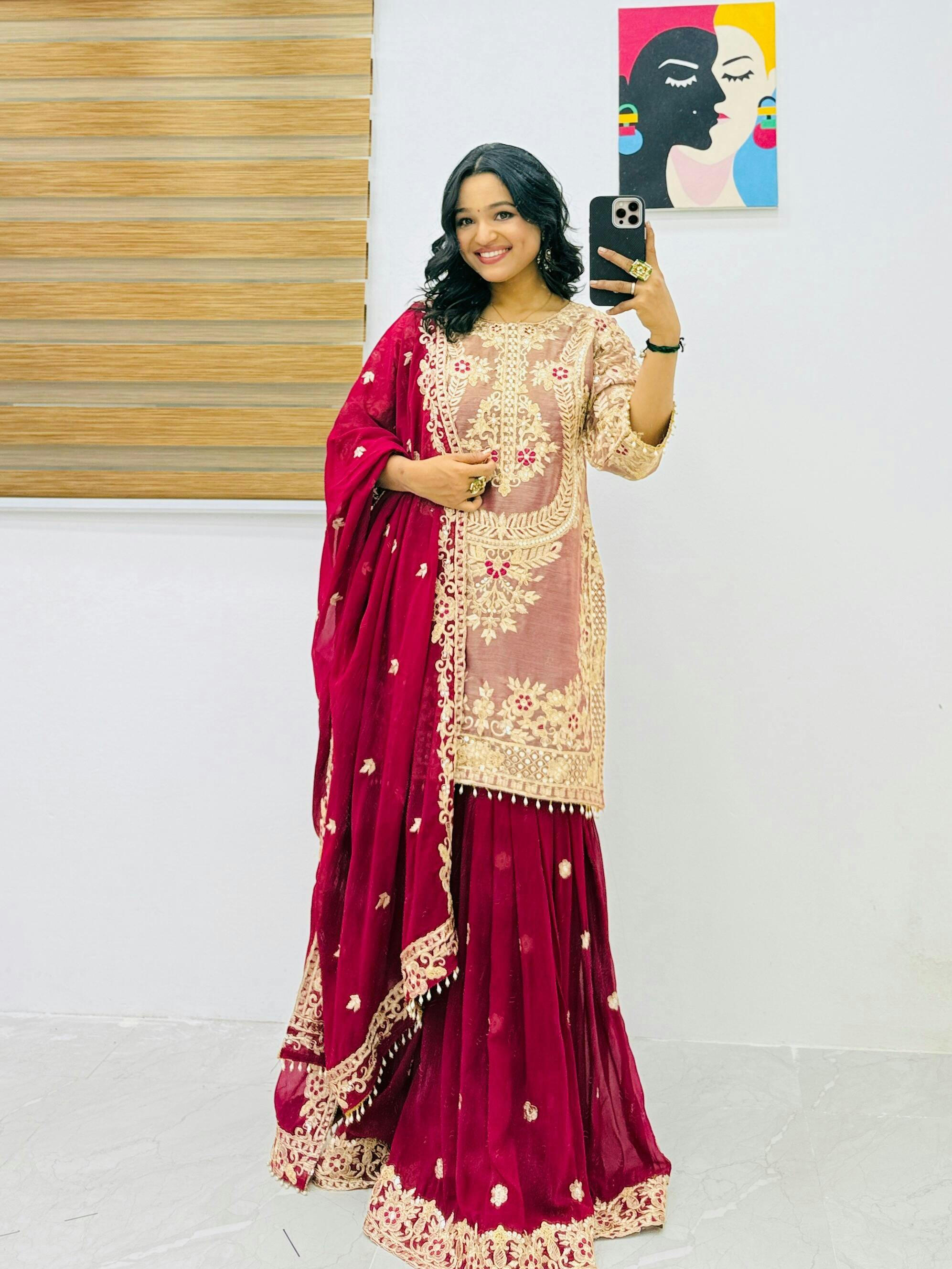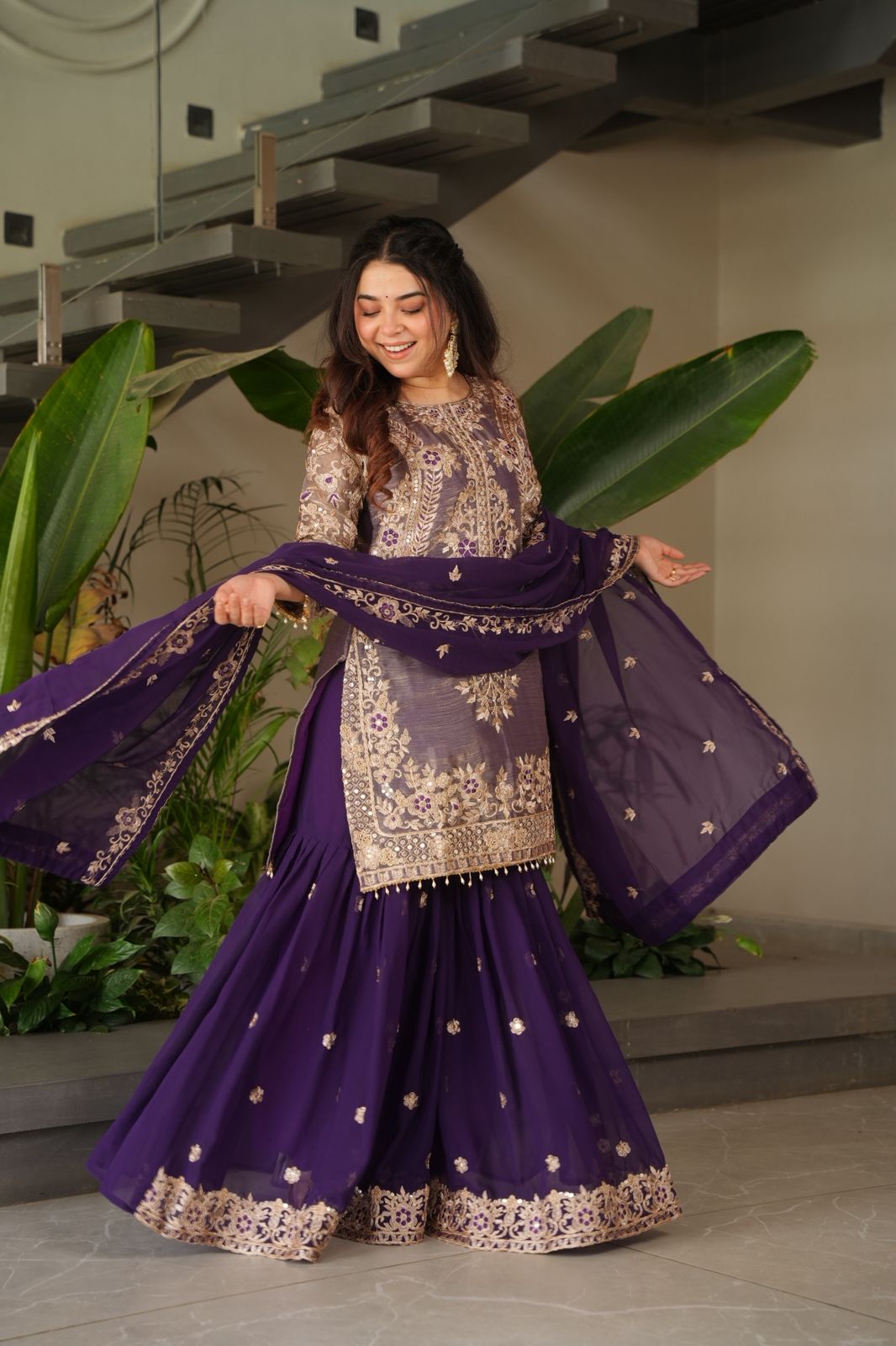 Pink and Purple Designer Embroidered Top Plazzo Dupatta Set