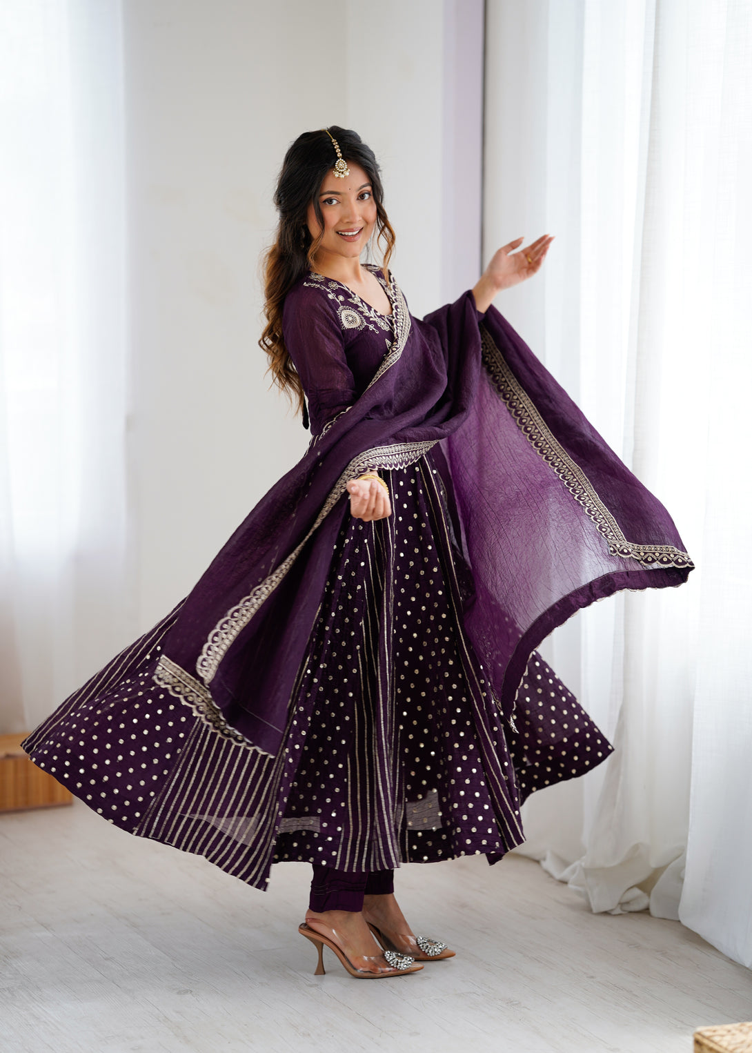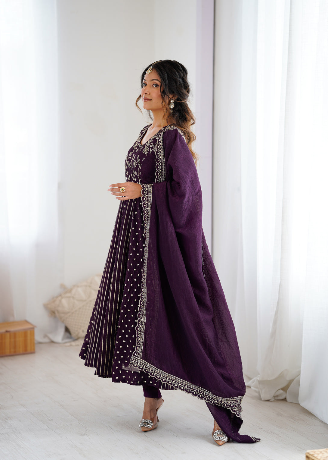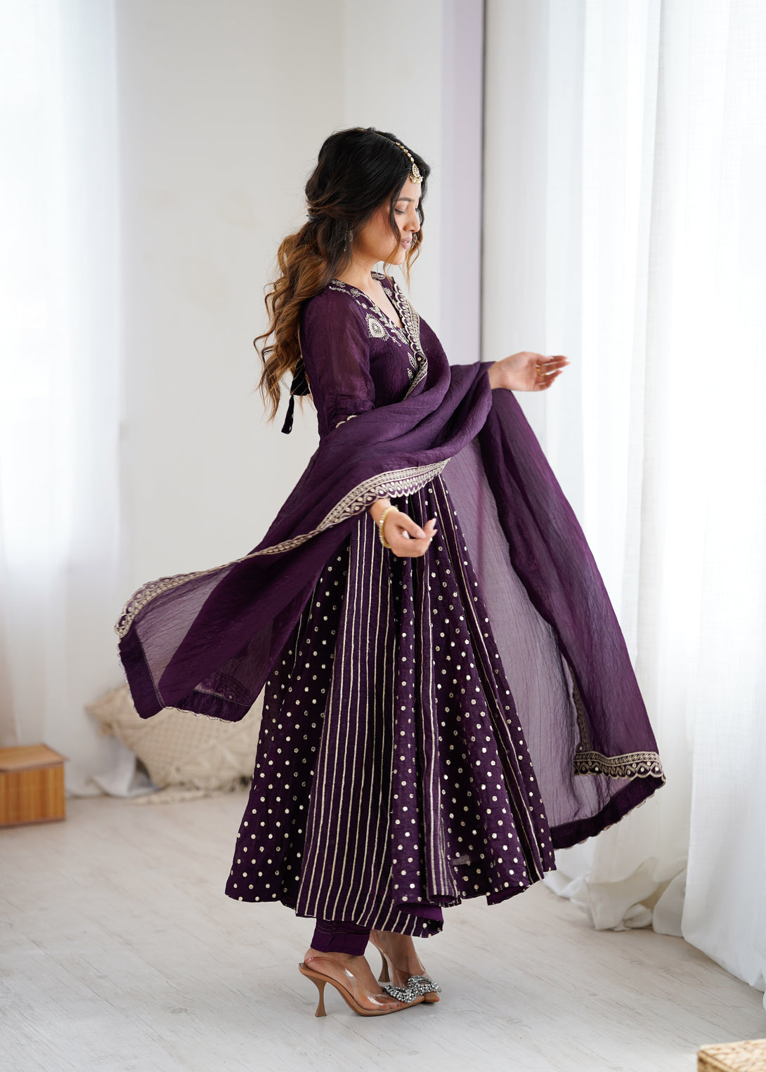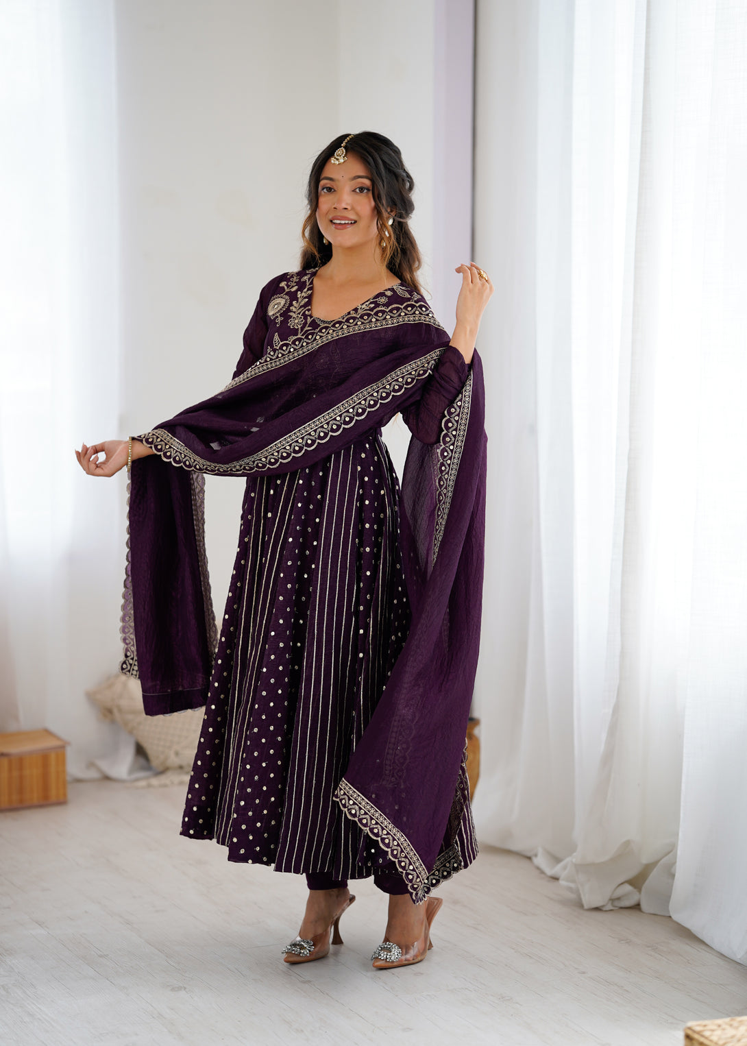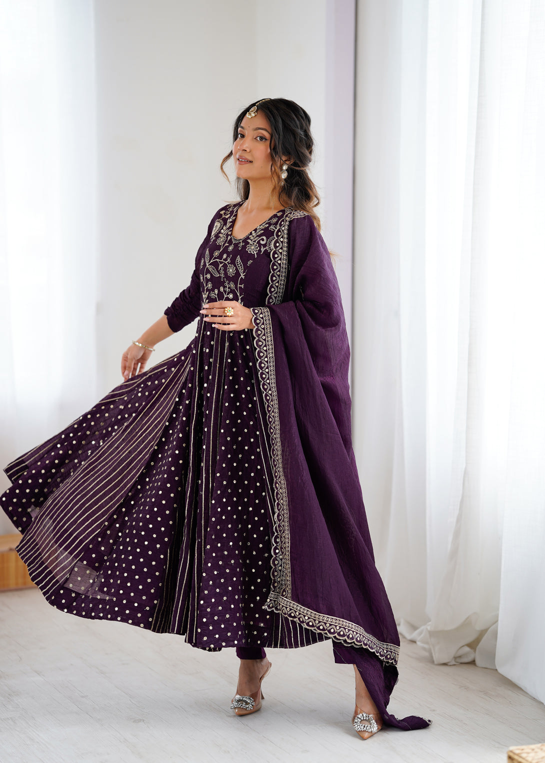 Royal Plum Mirror Embellished Anarkali Suit with Handcrafted Dupatta