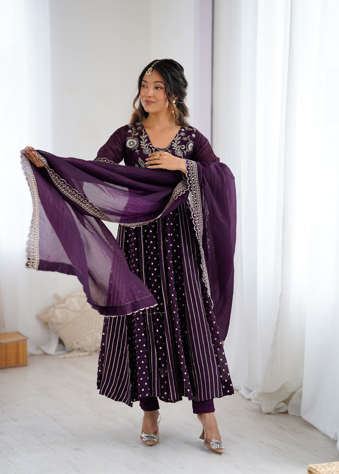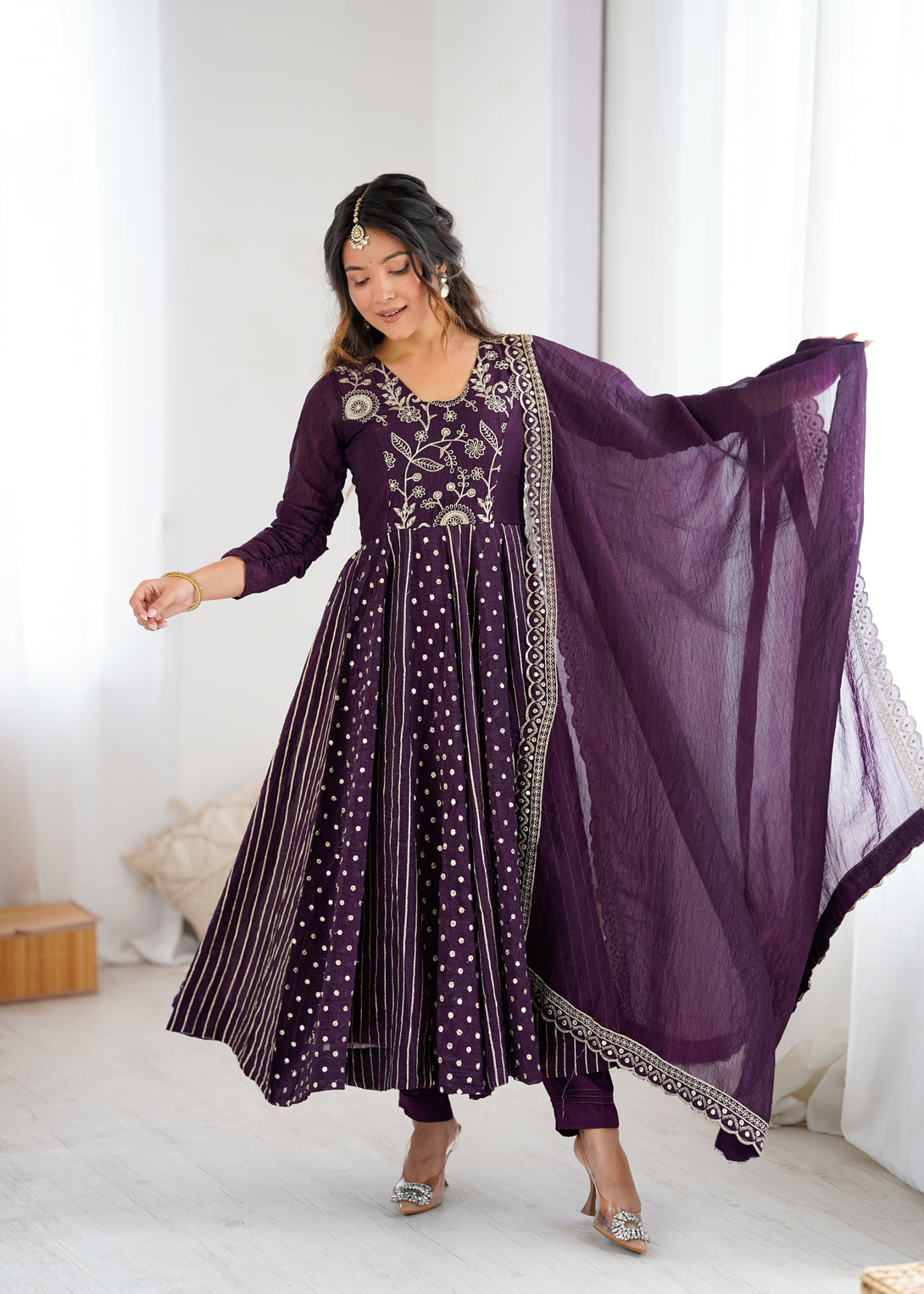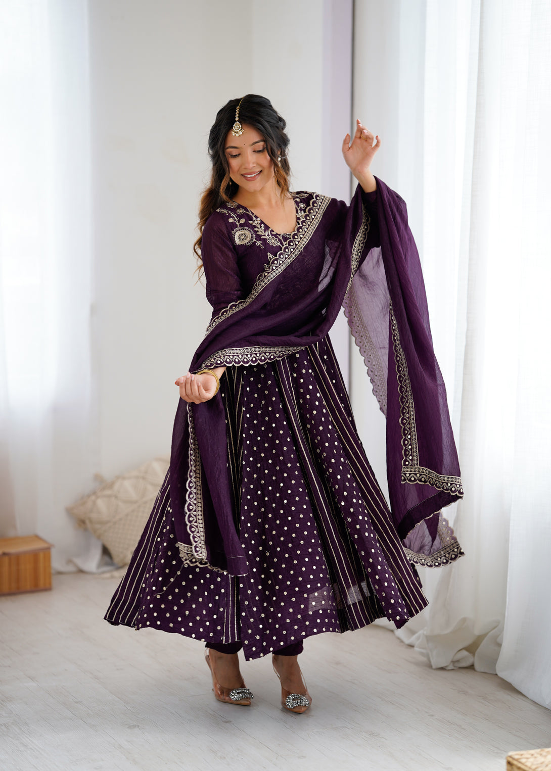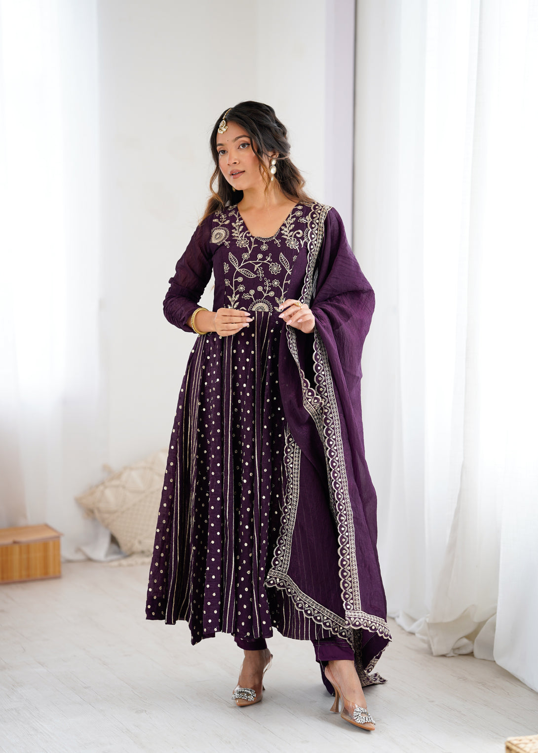 Royal Plum Mirror Embellished Anarkali Suit with Handcrafted Dupatta