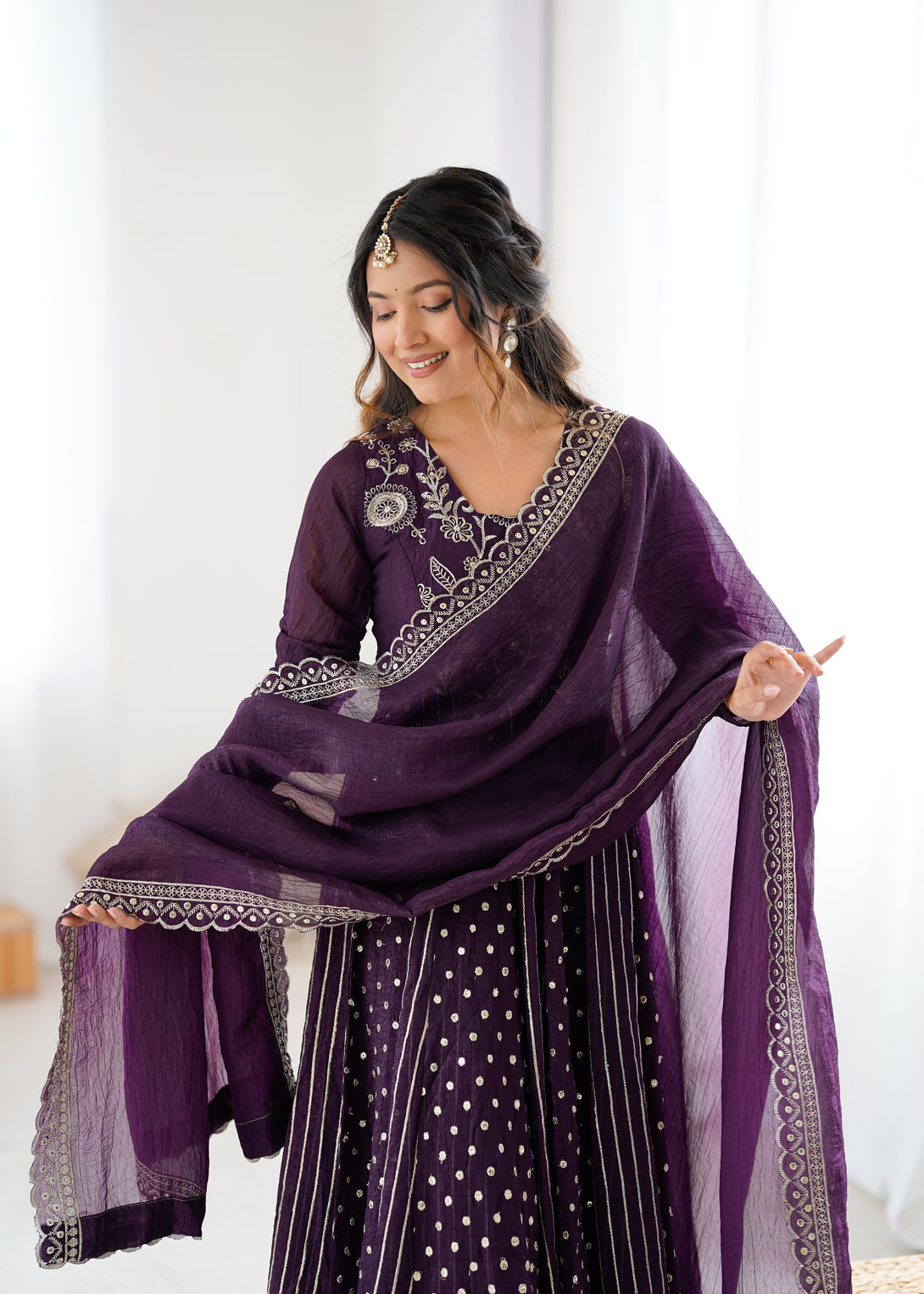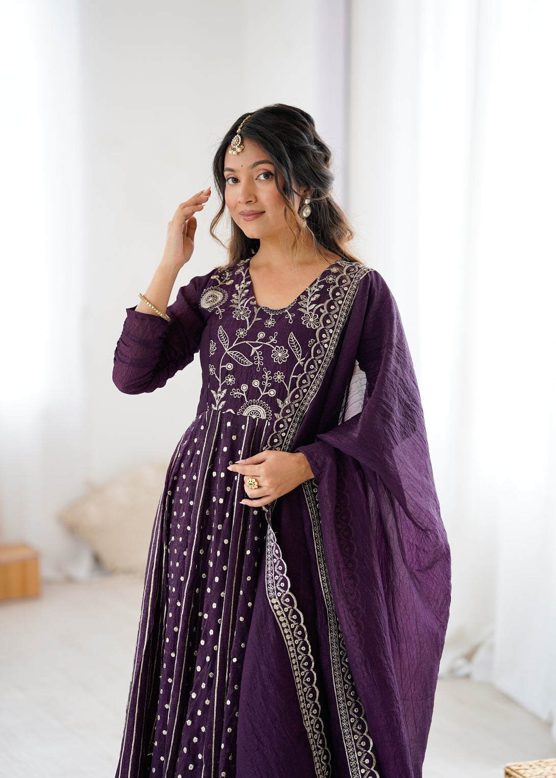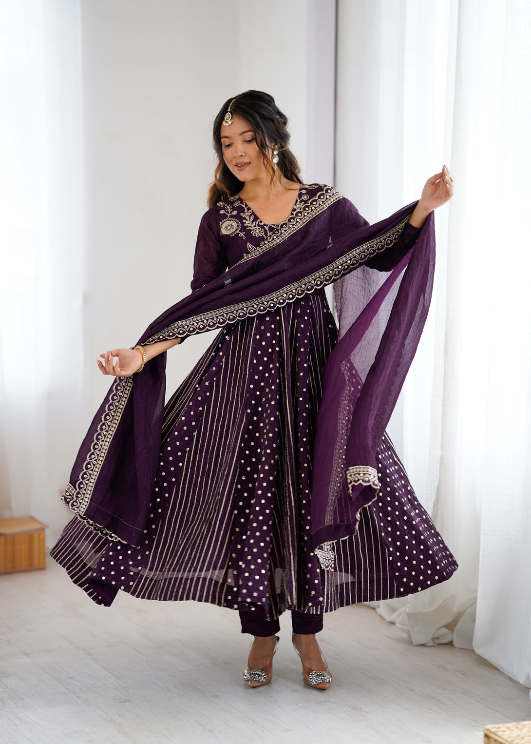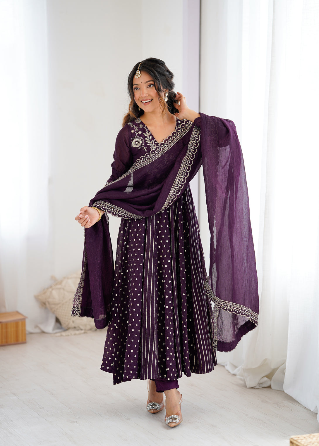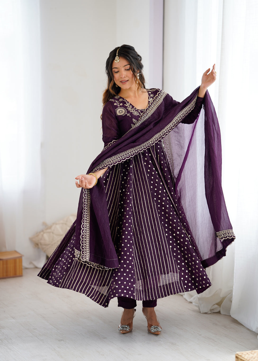 Royal Plum Mirror Embellished Anarkali Suit with Handcrafted Dupatta