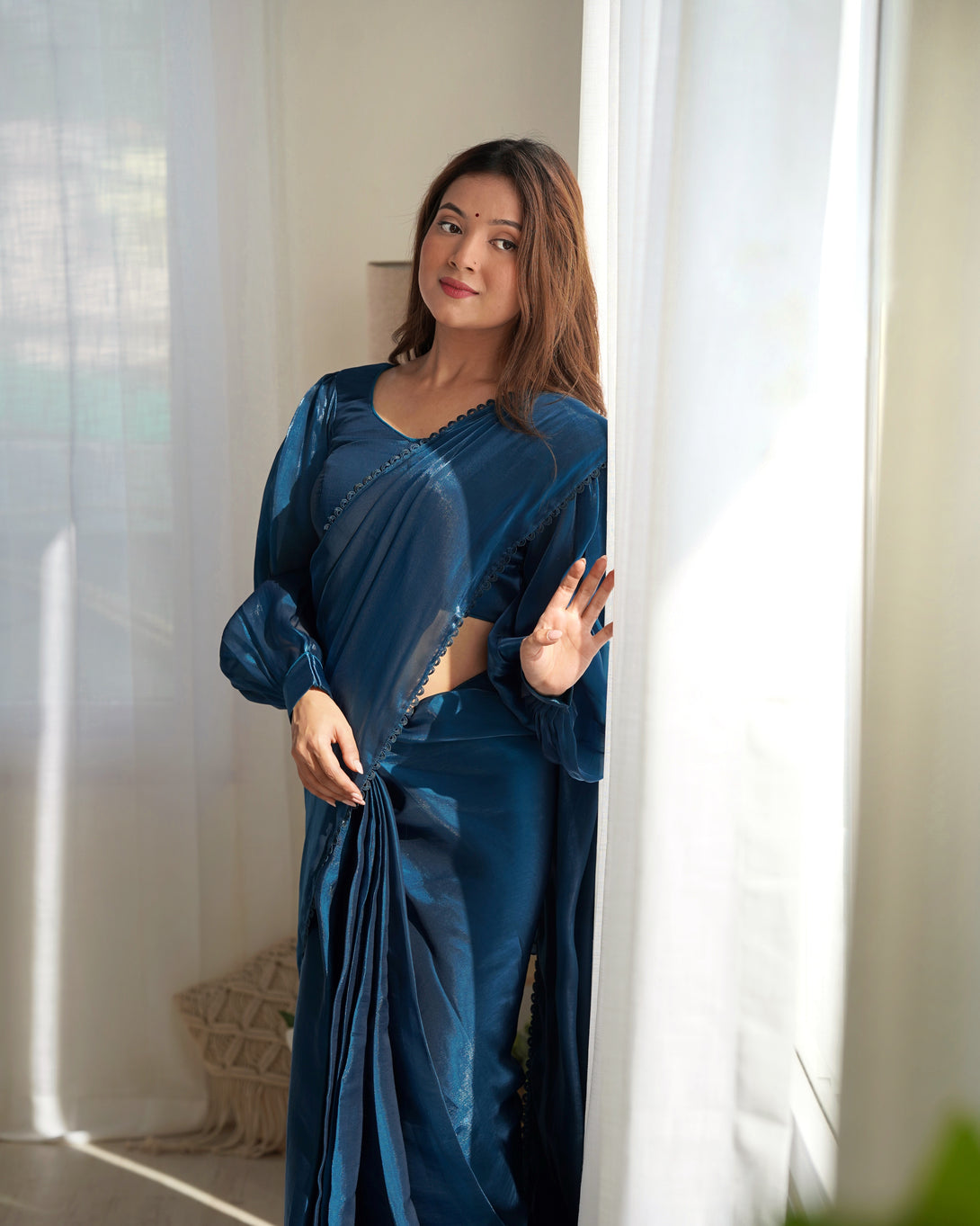 Pre-Draped Organza Saree with Designer Blouse – Ready to Wear Jimmy Choo-Inspired Partywear