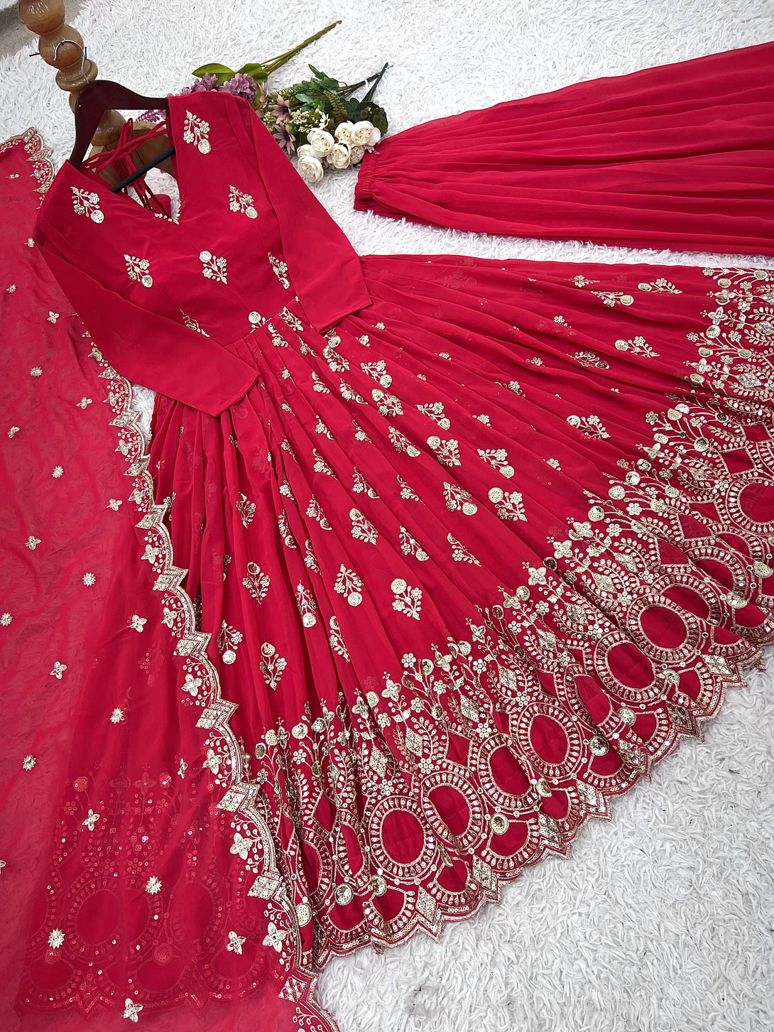 Wine Red Flared Ethnic Gown with Zari Embroidered Dupatta – Festive & Traditional Wear